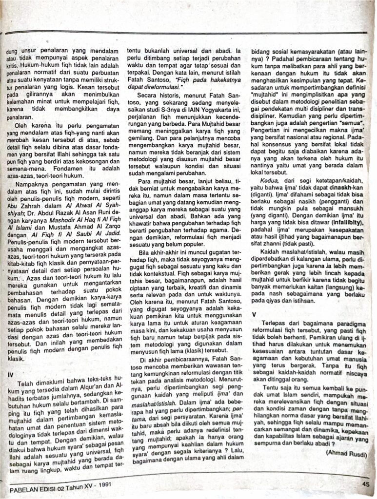 Tentu saja itu semua kembali ke pun-dak umat Islam sendiri, mampukah me reka merelevansikan fiqh dengan situasi dan kondisi zaman dengan tanpa hilangkan norma dasar yang bersifaling yah, sehingga figh selalu mampu memah carkan semangat dan dinamika, kepekaan dan kapabilitas Islam sebagai ajaran yang sempurna dan berlaku abadi?