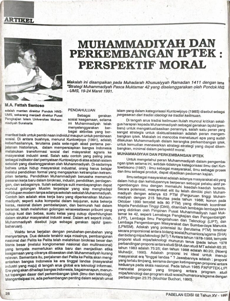 Waktu terus berjalan dengan perubahan-perubahan yang menyertainya. Dua dekade terakhir saja misalnya, pembangunan nasional dari Pelita ke Pelita telah melahirkan birokrasi besar dan bisnis besar (melalui konglomerasi nasional dan multinasional) yang ternyata memerlukan etika baru dan menjadikan etika keagamaan yang citranya dibawakan oleh Muhammadiyah kurang relevan. Sementara itu, perjalanan dari Pelita ke Pelita akan mengantarkan bangsa Indonesia ke era tinggal landas (masyarakat Industri yang maju) di tengah arus global era teknologi informasi, Era yang akan dihadapi bangsa Indonesia, bagaimanapun, menun-but topangan dasar dari perkembangan iptek (ilmu dan teknologi). Mengantisipasi ini, ada perkembangan penting dalam sejarah umat islam yang dalam kategorisasi Kuntowijoyo (1985) disebut sebagai pergeseran dari tradisi ideologi ke tradisi keilmuan.