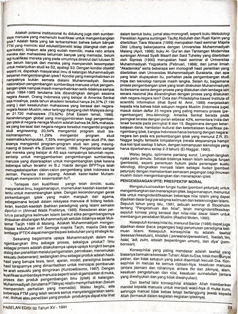 Terlepas dan kualifikasi yang telah dimiliki, suatu masyarakat ilmu, bagaimanapun, memerlukan kaedah-kaedah ter-tentu untuk menembangkan iptek. Dengan kecenderungan gerak perkembangan iptek yang makin menjauh dari agama, sebagaimana terjadi dalam rekayasa manusia di bidang kedokteran, kaedah-kaedah (bahkan paradigma) yang Islami semakin diperlukan (Ahmad Watik Pratiknya, 1989). Kesadaran akan perlunya paradigma keilmuan Islami berikut etika pengembangannya dirasakan di kalangan Muhammadiyah setidak-tidaknya sejak Muktamar Tarjih 1989 di Malang. Adakah Muhammadiyah mengantisipasi kebutuhan ini? Semoga majelis Tarjih, majelis Dikti dan lembaga IPTEK dapat mengantisipasi kebutuhan yang strategik itu.