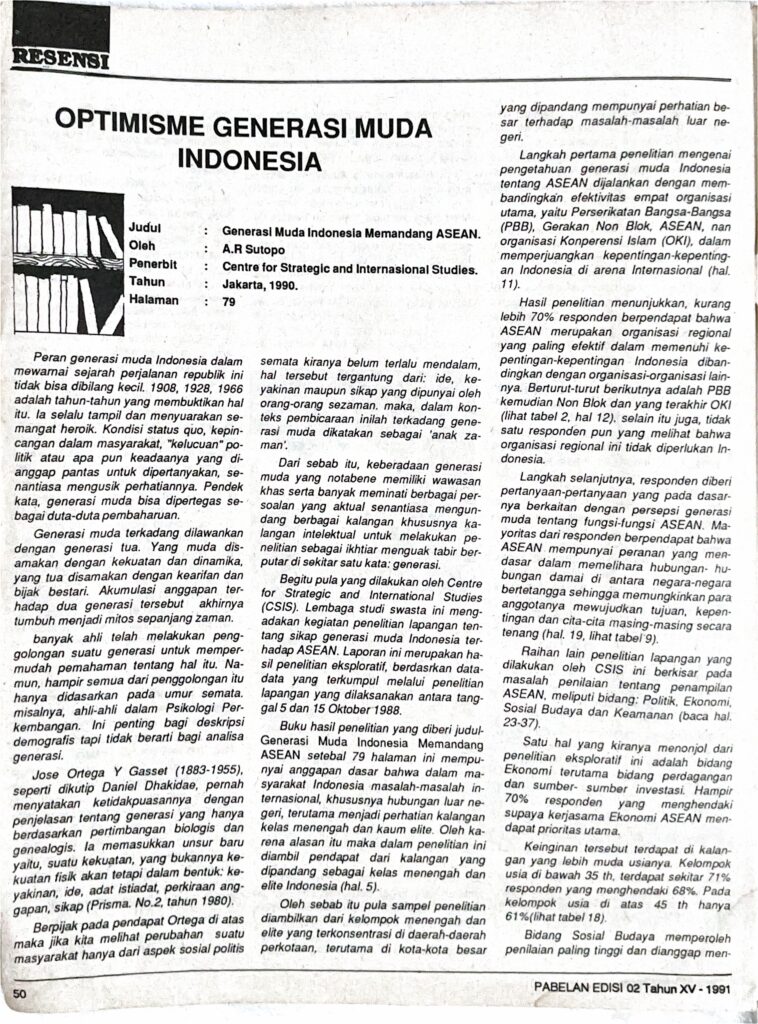 Buku hasil penelitian yang diberi judul-Generasi Muda Indonesia Memandang ASEAN setebal 79 halaman ini mempunyai anggapan dasar bahwa dalam masyarakat Indonesia masalah-masalah internasional, khususnya hubungan luar negeri, terutama menjadi perhatian kalangan kelas menengah dan kaum elite. Oleh karena alasan itu maka dalam penelitian ini diambil pendapat dari kalangan yang dipandang sebagai kelas menengah dan elite Indonesia (hal. 5).